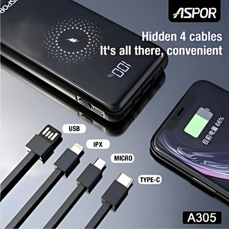 Aspor A305 All-in-One Power Bank 10000mAh 22.5W with Built-in Cables – Black