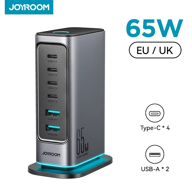 6 ports: 4 USB‑C + 2 USB‑A for flexible charging