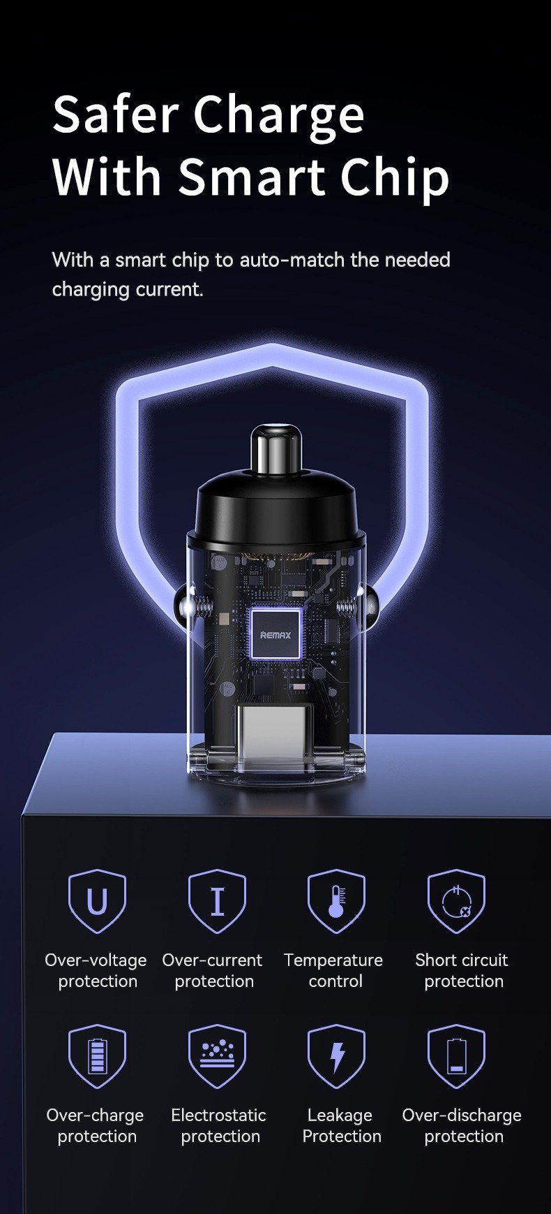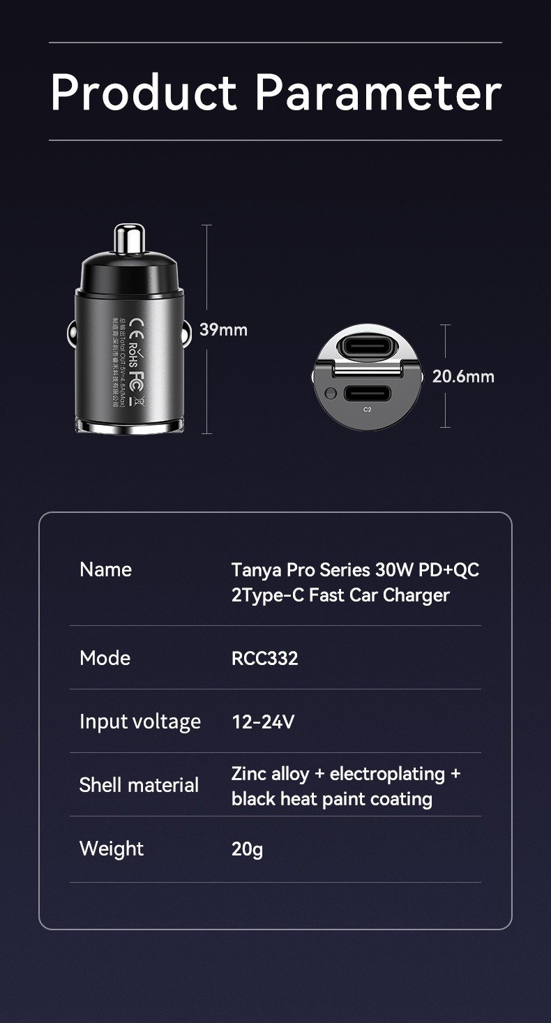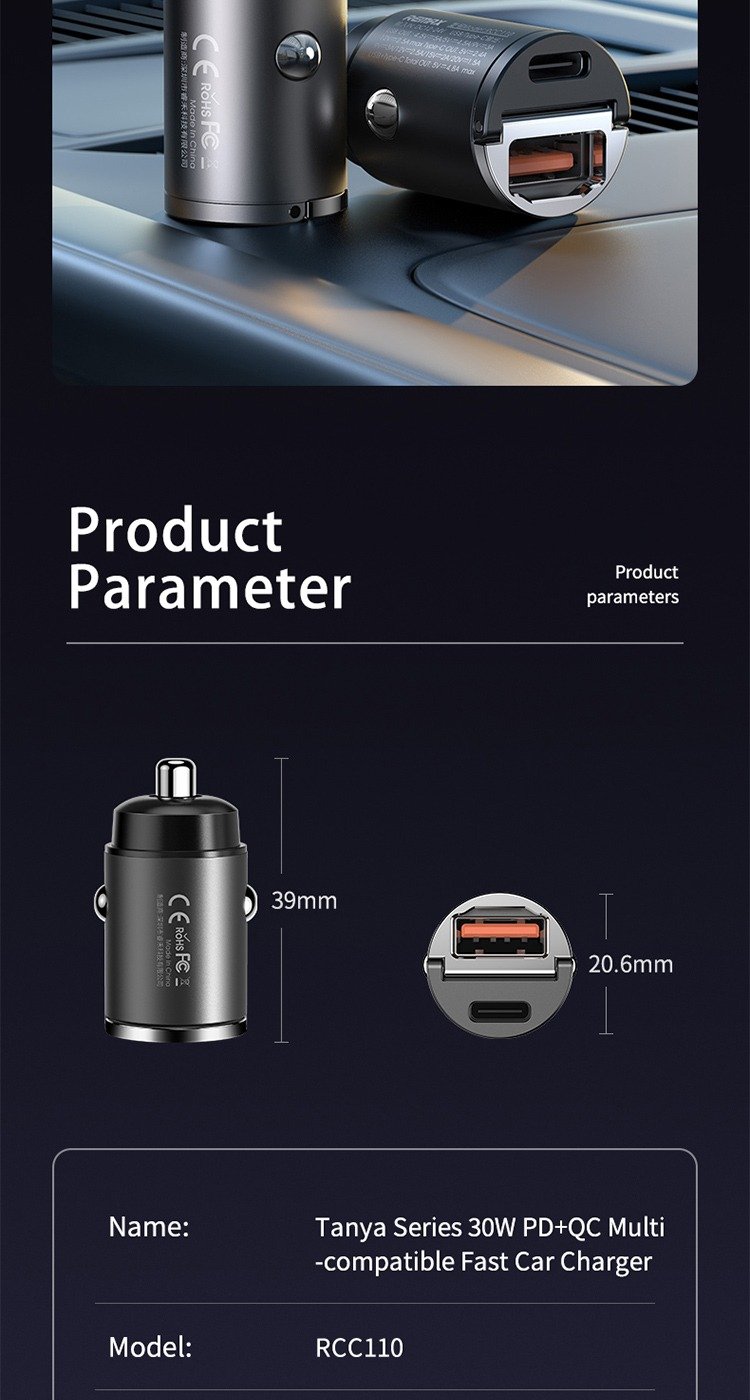 Dual‑port car charger with 30 W Power Delivery and Quick Charge support for fast charging on the road.